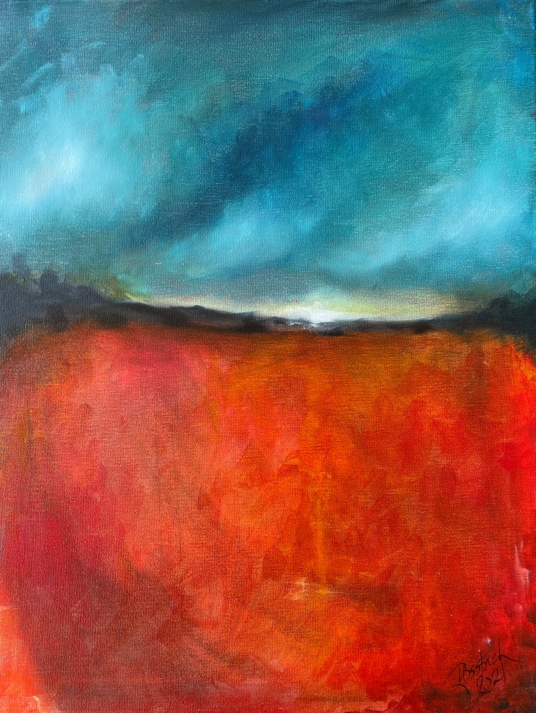 Abstract Landscapes became the activity that began a process of detoxifying after leaving a job that created a build up of stress over the years, with the last year and a half bringing that stress to a level that should have been alleviated with the idea of retirement, but instead culminated to using coping methods to get through the day. The first one, titled Ode to Turner originated from just putting brush to canvas and letting the process of creating take place. The results reminded me of Joseph Mallord William Turner‘s work, but with less drama of the historical events he included. These became imaginary landscapes that addressed color and open spaces.