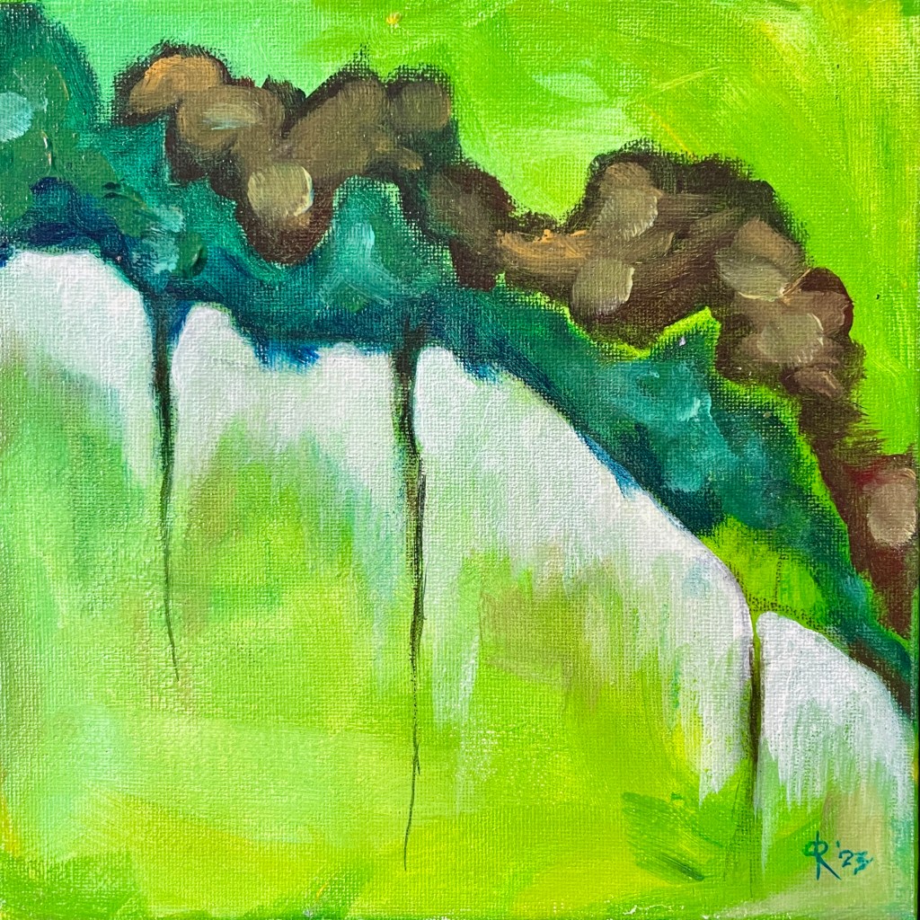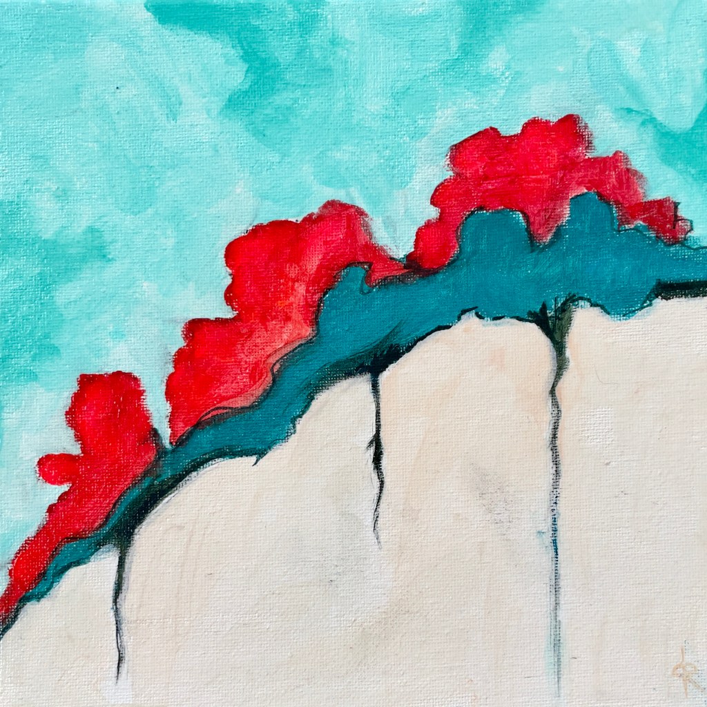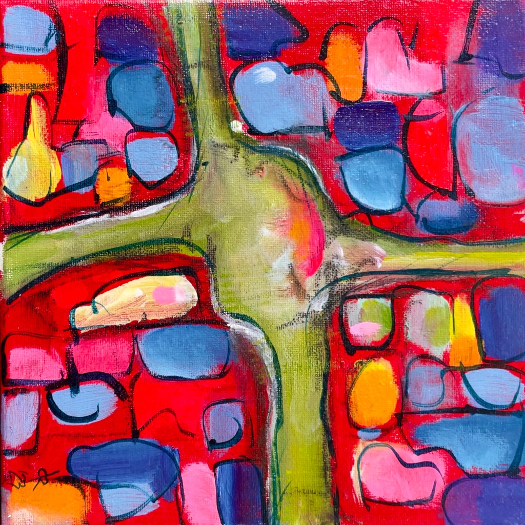 My close friends are astounded by the fact that I can create what I do without the ability to bring up an image. It’s not bothersome or as shocking as when I first learned of it, but I’ve now determined that I react to either conversation for my ideas, or if I am in front of a blank canvas, I just choose some paint colors, and react to that first brush stroke. Sometimes, I use a reference photo for a particular shape/form of an object but then it’s reaction after reaction after reaction.