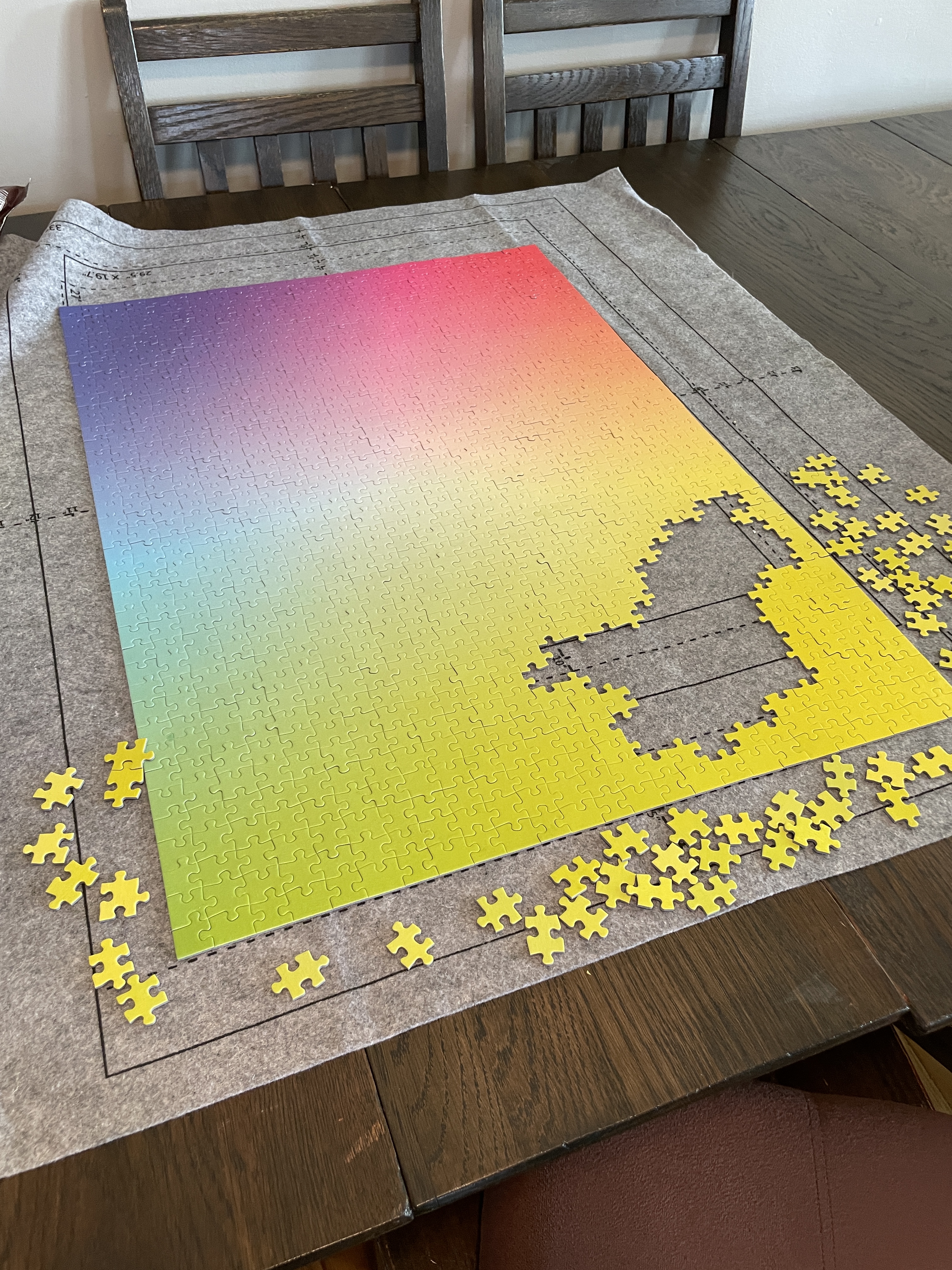 While purging some things, I found this 1000 piece puzzle I bought which I started a couple days ago. This one was made for me! Color, color and more color! It was smooth sailing until this point!