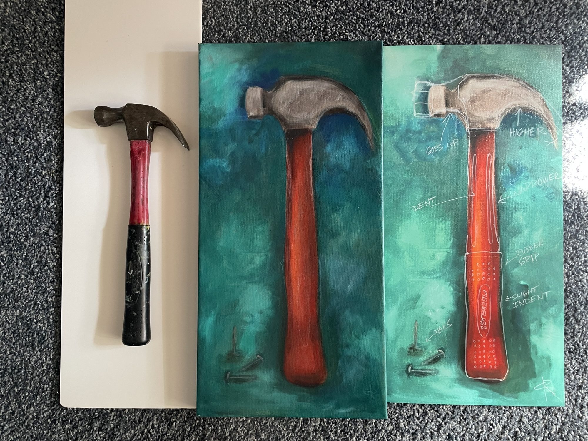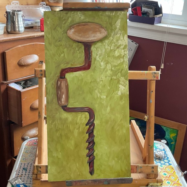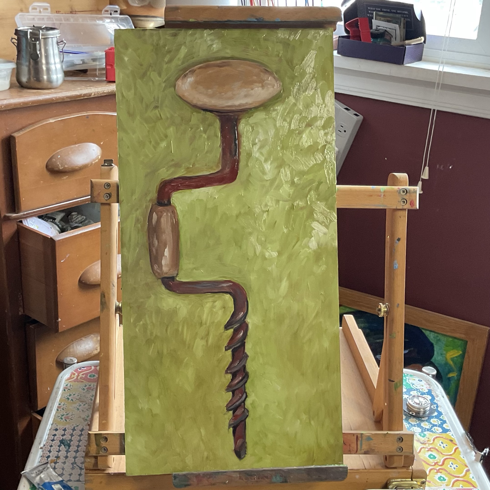 I’ve now completed a hammer, a scissors, and this hand drill for the tools. I am painting these without a photo reference, the physical object, or a mental image because of the image free thinking that is aphantasia.