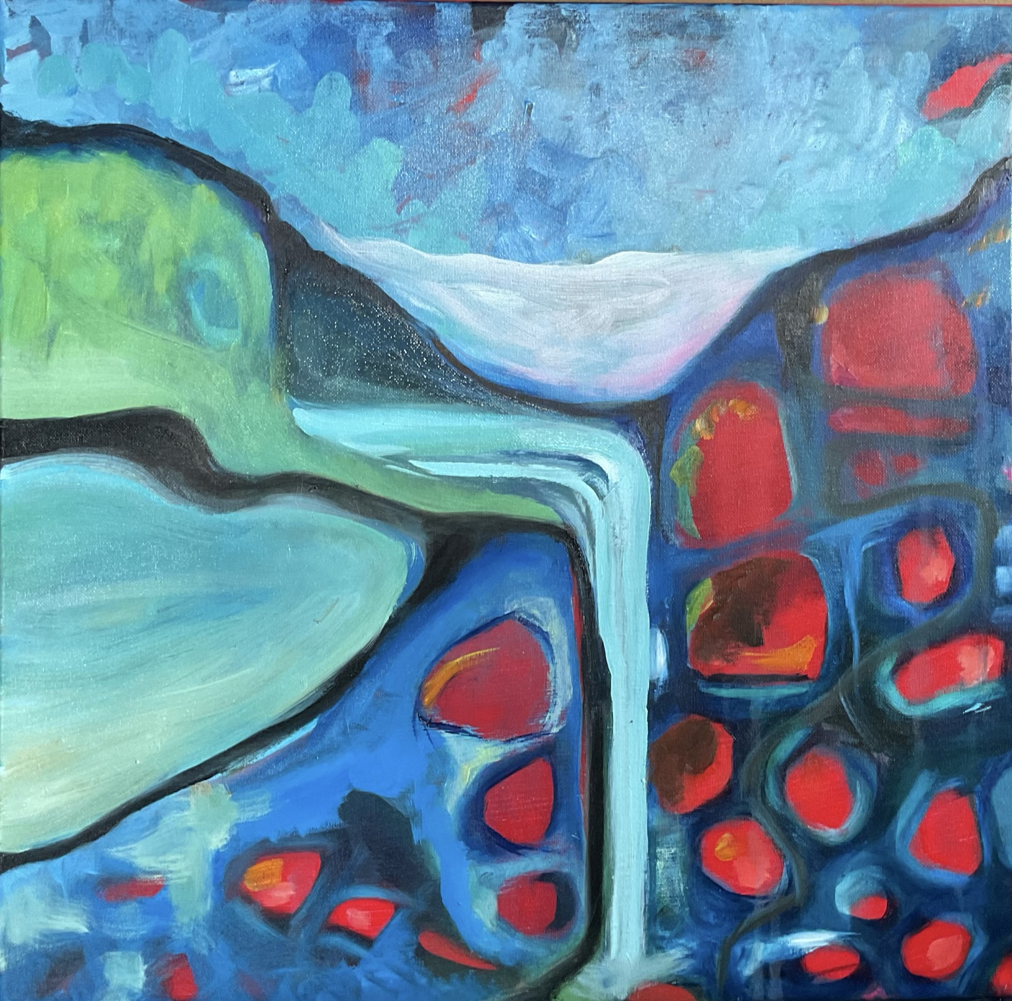 The one below looks better here, but it’s still a flippin’ mess. The top is the most current version and none of them work at all for me, but I am hoping it will eventually reveal enough for me to work with. During my painting session where I go “live,” I try to narrate any process or discoveries made along the way. In this case of this apparition painting, I feel like I am taking those very non-objective shapes, colors and line and leading my brain to solid memories of places. While vague, this one reminded me of Multnomah Falls, Turtle Lake where the beaver dam is and the lake above it. So the tools, the memories and the apparitions are the goals I set for myself along with creating a new body of work. And I had a light bulb moment to start with apparition, but le the canvas reveal the memories I have vs. me doing a separate memory painting and a separate apparition. This allows the canvas, the brush, and the paint to direct me vs. me directing the paint.