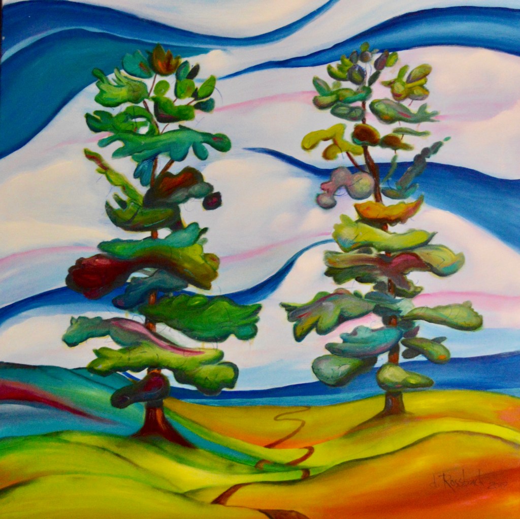 Along Highway 71, there is a stately white pine that sits near the edge of the road. This tree has become a muse for Rossbach who has rendered well over 60 versions of the tree in oil painting, acrylic, pastel, wood cut, etchings and even stained glass. Rossbach titled it “The Spirit Tree” when she created the above image in oil, on a 42″ x 62″ canvas. Currently she is working on another canvas the exact same size and in oil again, which has a working title of “The Doppleganger.”