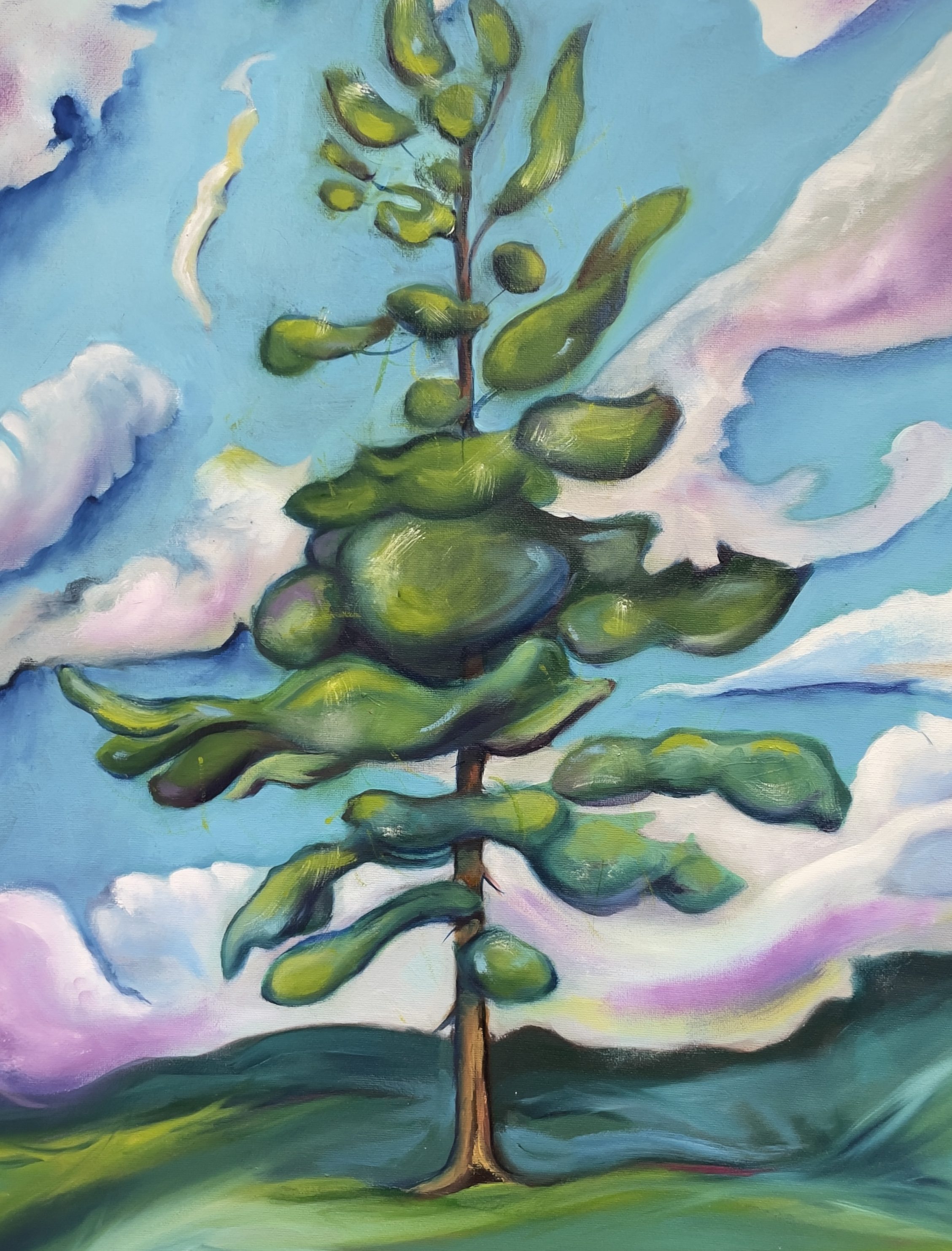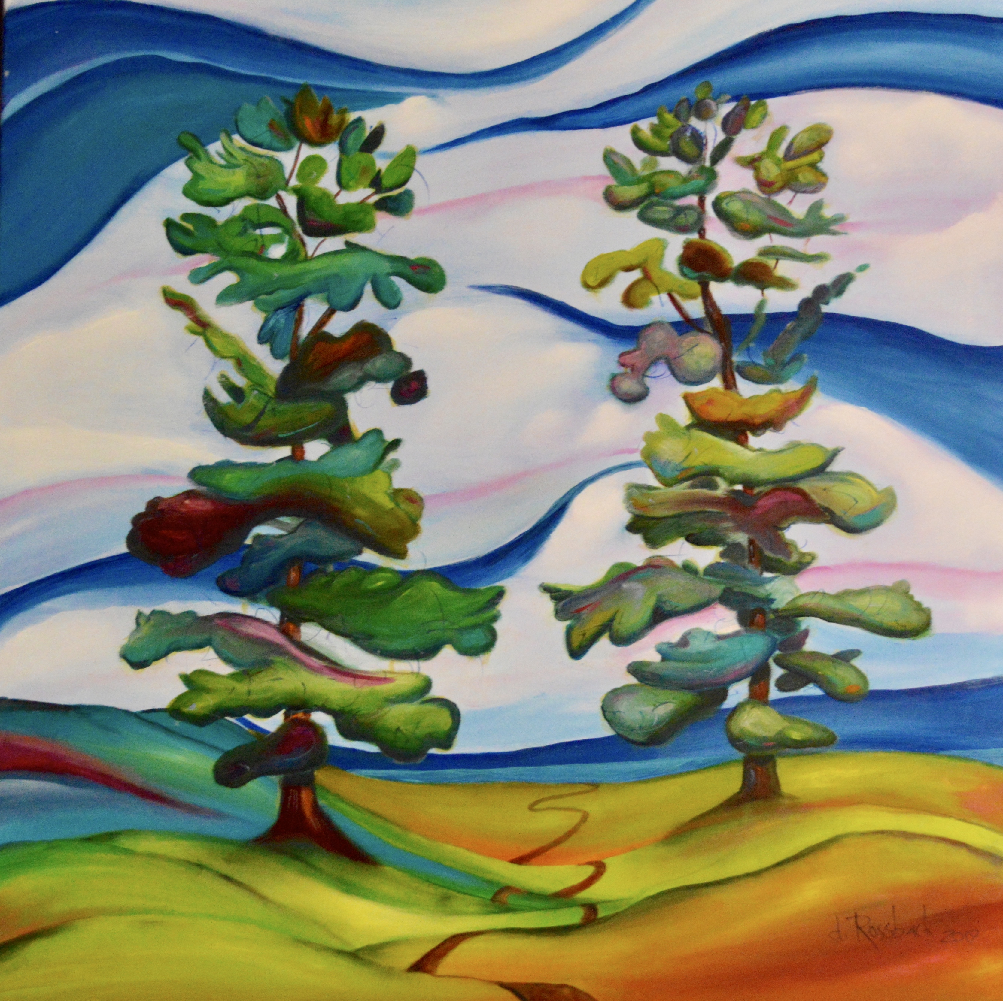 Along Highway 71, there is a stately white pine that sits near the edge of the road. This tree has become a muse for Rossbach who has rendered well over 60 versions of the tree in oil painting, acrylic, pastel, wood cut, etchings and even stained glass. Rossbach titled it “The Spirit Tree” when she created the above image in oil, on a 42″ x 62″ canvas. Currently she is working on another canvas the exact same size and in oil again, which has a working title of “The Doppleganger.”
